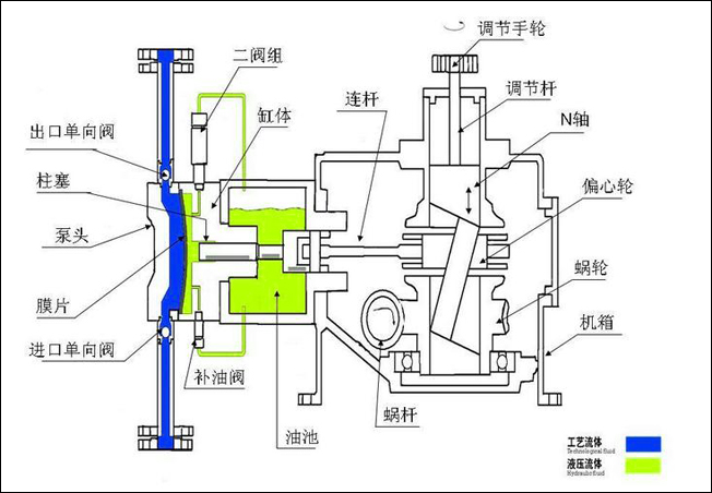 電機(jī)經(jīng)聯(lián)軸器帶動(dòng)蝸桿并通過蝸輪減速使主軸和偏心輪作回轉(zhuǎn)運(yùn)動(dòng),由偏心輪帶動(dòng)挺桿在導(dǎo)筒內(nèi)作往復(fù)運(yùn)動(dòng)。連同柱塞,通過單向閥的作用使泵腔內(nèi)逐漸形成真空,吸入閥打開,吸入液體;當(dāng)柱塞向前死點(diǎn)移動(dòng)時(shí),此時(shí)吸入閥關(guān)閉,排出閥打開,液體在膜片的推動(dòng)下排出。在泵通過調(diào)節(jié)一定的行程的往復(fù)順還工作形成連續(xù)有壓力、定量的排放液體。